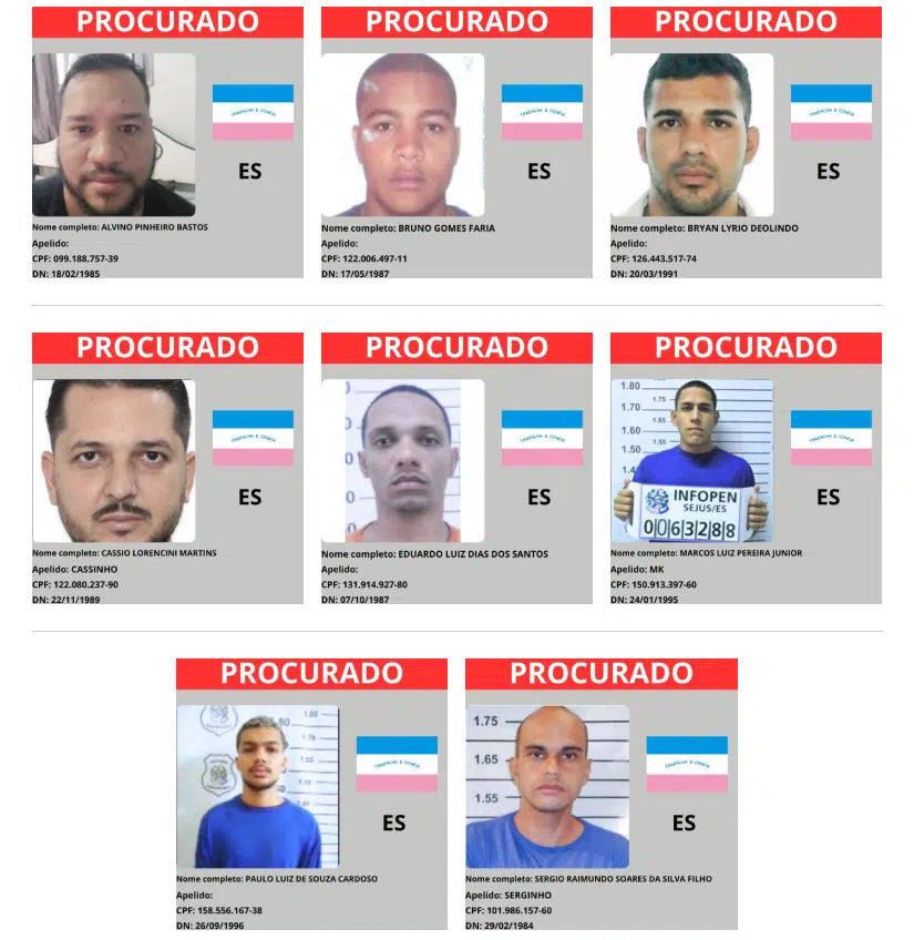 Entre os procurados do Espírito Santo está Bryan Lyrio Deolindo, que possui mais de 10 mandados de prisão em aberto, incluindo por homicídio e porte ilegal de arma de fogo de uso permitido. Ele integra a facção Comando Vermelho e atua em cidades da Grande Vitória, além das regiões Norte e Noroeste do Estado. Bryan está foragido desde 2021, quando escapou da Penitenciária Estadual de Vila Velha e não foi mais recapturado. As investigações apontam que ele se escondeu no Complexo da Maré, no Rio de Janeiro. Ele também é apontado pela polícia como responsável pelos 550 kg de cocaína pura encontrados em um bunker em uma casa no bairro Ponta da Fruta, em Vila Velha, em outubro de 2024.