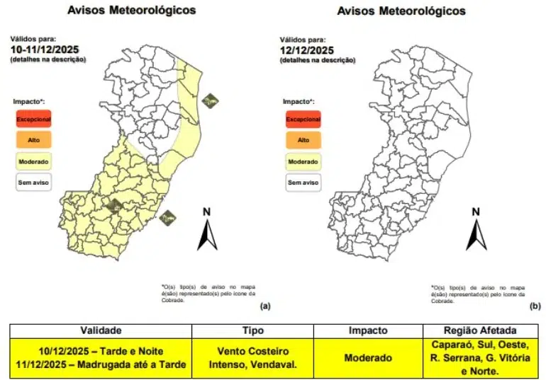 A Defesa Civil do Espírito Santo emitiu um alerta na tarde desta quarta-feira (10) sobre a possibilidade de ventos costeiros fortes e vendavais em diversas regiões do estado. O aviso, classificado como moderado, tem validade até a tarde desta quinta-feira (11) e abrange o Caparaó, sul, oeste, região serrana, Grande Vitória e norte do estado.